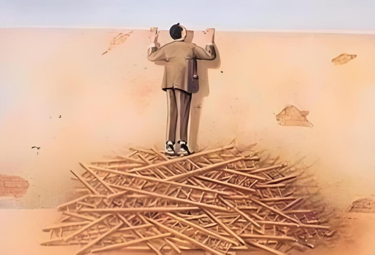漫画充满了讽刺意味。漫画中的人被墙困住,无法顺利逃出去。尽管墙内有很多梯子,但漫画中的人物却没有正确利用,而是将梯子胡乱堆积,意图踩着堆砌的梯子翻越高墙,结果无济于事。这启示我们要正确利用资源,如果忽视资源的作用和价值,资源的优势也将荡然无存。